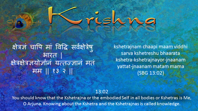 SBG 13:02 You should know that the Kshetrajna or the embodied Self in all bodies or Kshetras is Me, O Arjuna. Knowing about the Kshetra and the Kshetrajnas is called knowledge.
