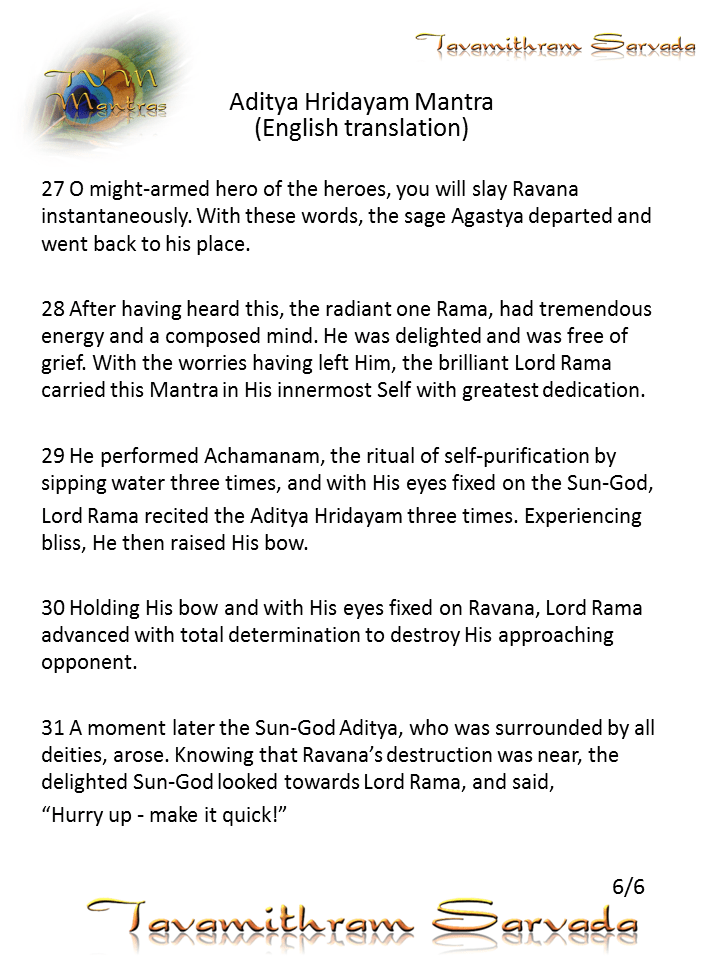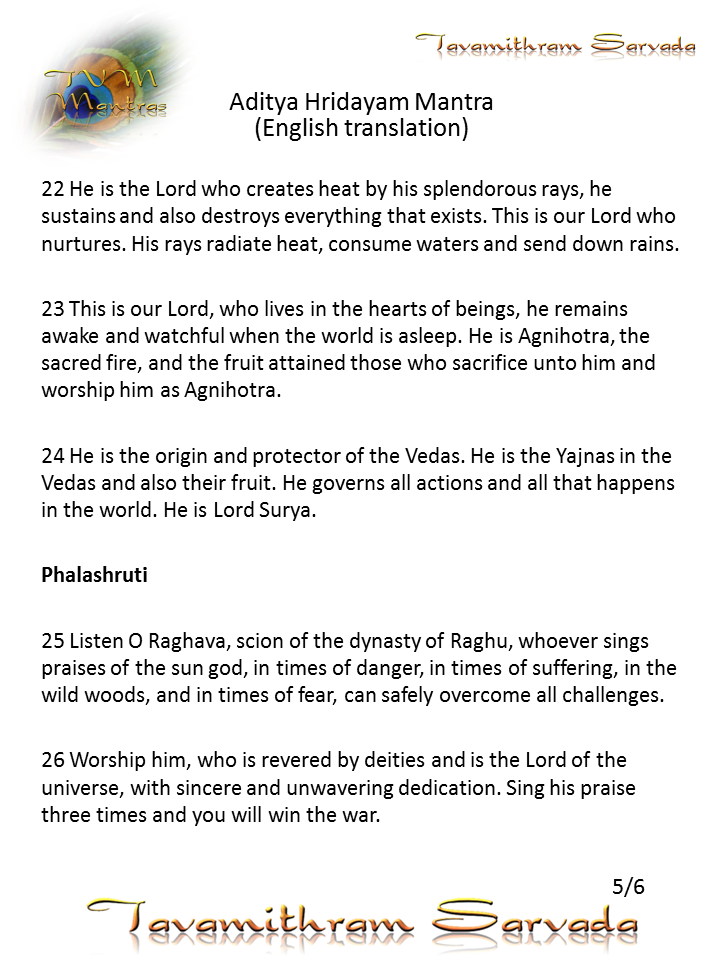 The Aditya Hridayam Mantra is considered to be one of the most powerful Mantras to help a seeker, build immense power within them to be able to fight all kinds of challenges, including those threatening health or even life. Understanding the meaning of this Mantra aids a person in overcoming false ego and vanity using the story of Ravana who was ego, arrogance, vanity, and extreme haughtiness.