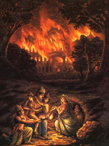 Sanskrit name for the house of lac is Laakshaagruham. Duryodhana’s plan was to burn the house when the Pandavas were sleeping. But as Yudhishtra already knew about the plan, he discussed with Vidura about it in order to protect him and his family from the murder attempt. They sent a person who was an expert in mining, to build a secret tunnel from the house of lac that would lead them into a nearby forest.