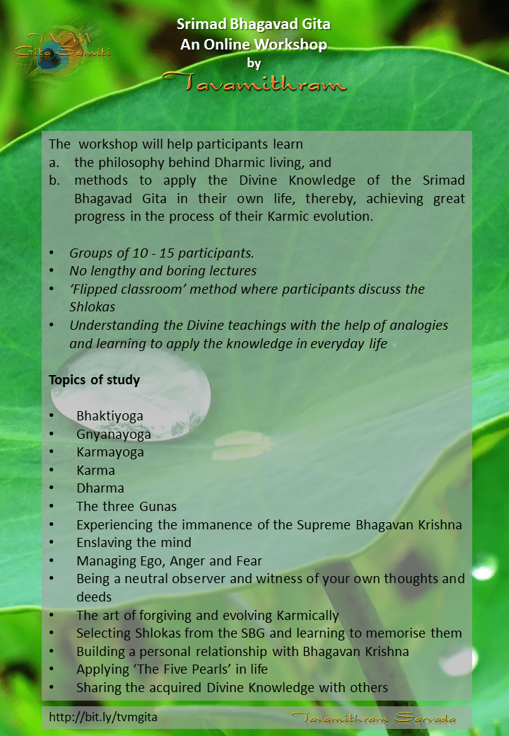 Some of our friends have requested me for a Srimad Bhagavad Gita online workshop to help people study the scripture and learn to apply its teachings in their life.
