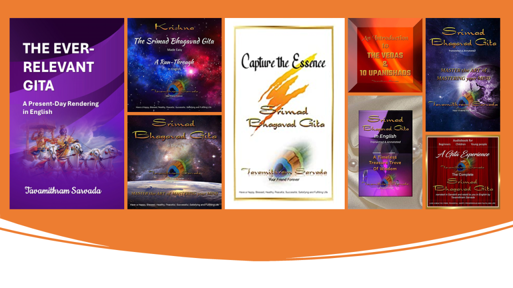 | Tavamithram’s publications, available as paperbacks, audiobooks, and ebooks, include: 1. The Srimad Bhagavad Gita in English Retold and Read for You by Tavamithram Sarvada 2. Srimad Bhagavad Gita – Translated & Annotated: Master the Art of Mastering your Mind 3. The Srimad Bhagavad Gita in English – Translated and Annotated: A Timeless Treasure Trove of Wisdom 4. The Srimad Bhagavad Gita – Made Easy: A Run-Through in English 5. An Introduction to the Vedas and 10 Upanishads 6. A Gita Experience with Tavamithram Sarvada: The Complete Srimad Bhagavad Gita Narrated in Sanskrit and Retold to You in English by Tavamithram Sarvada 7. Capture the Essence – Srimad Bhagavad Gita 8. The Ever-Relevant Gita: A Present-Day Rendering in English |