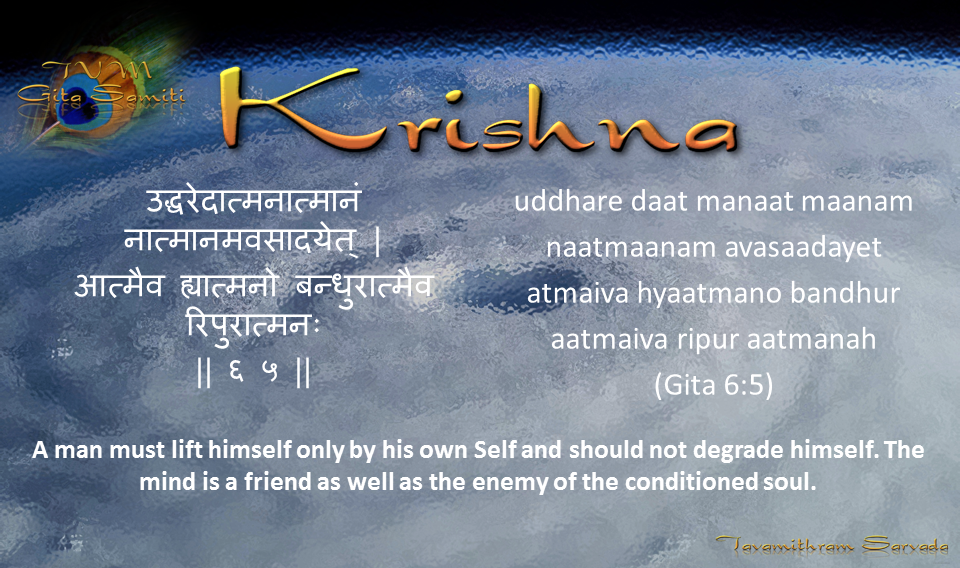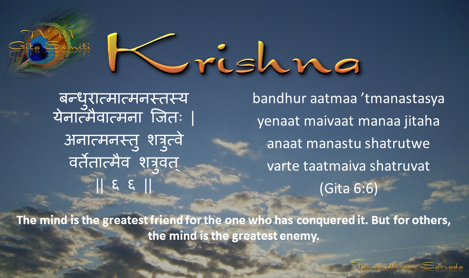 The Srimad Bhagavad Gita makes you aware of the truth that everything stems from the mind and therefore training the mind with the right knowledge, decides not only the life of a person but also the entire process of his or her Karmic evolution. The will to do something or to not do something originates in the mind. Every action begins with a thought. The first step followed by all other steps in a journey of ten thousand miles begins in the mind. Everything is in the mind.